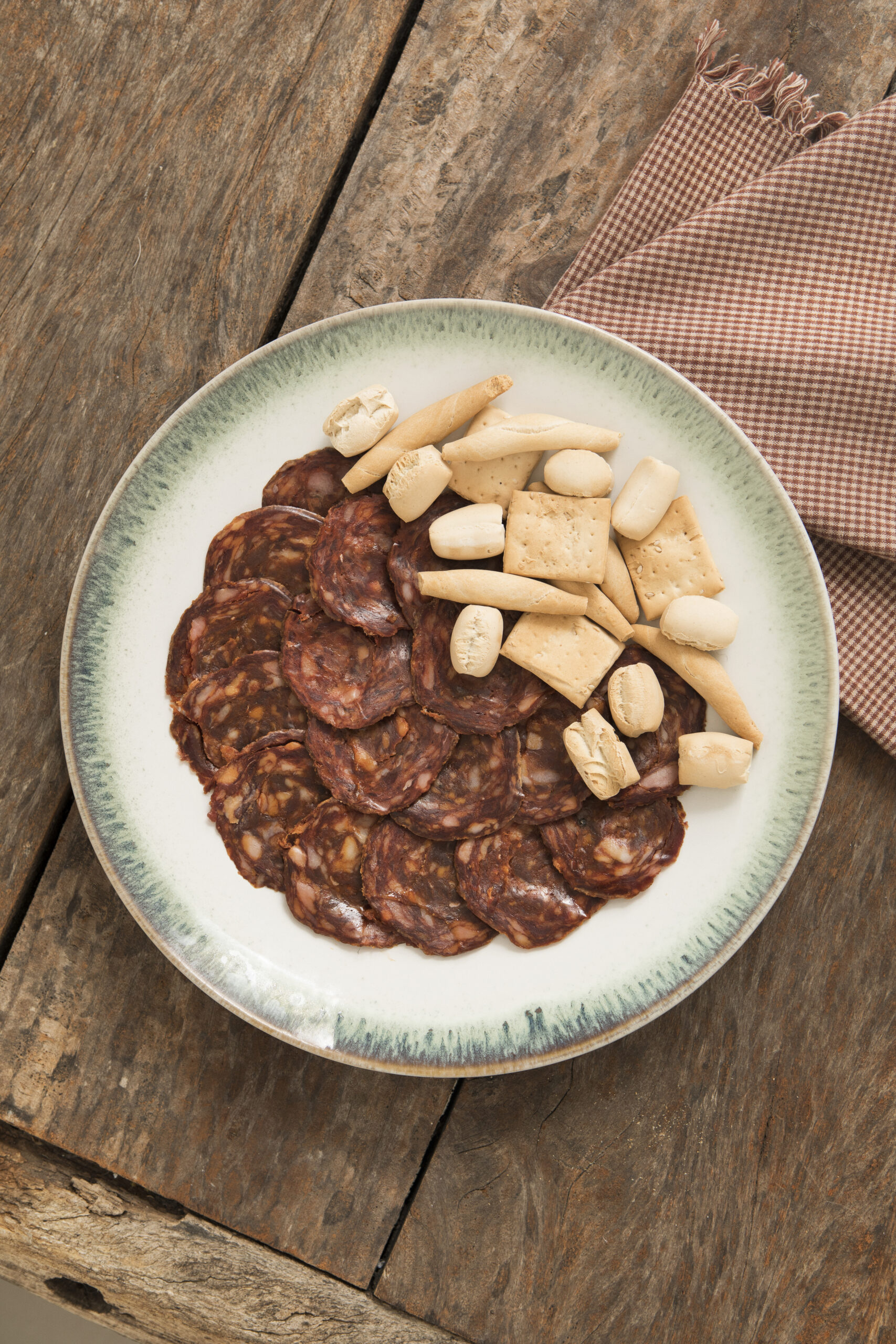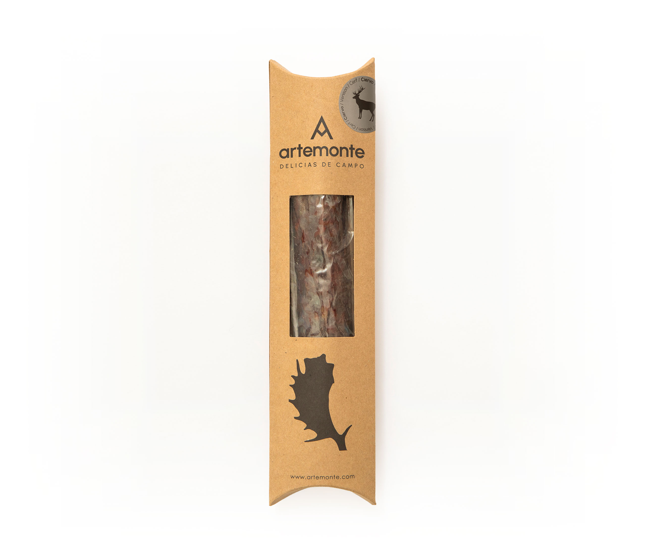 Carne de ciervo 52,09%, Carne de cerdo, Especias, Sal, Dextrina, Proteína de Soja, Lactosa (leche), Dextrosa, Emulgentes E-450 y E-451, Colorante E-120, tripa de colágeno |
